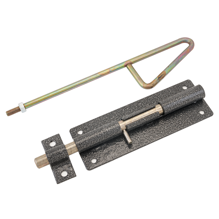Засов накладной для металлических дверей. Материал - сталь, полимерное покрытие. Габариты корпуса - 65х180 мм, 4 крепежных отверстия. Цилиндрический ригель диаметром 13 мм с вылетом 55 мм. В комплекте ответная планка 65х25 мм, удлиненный стержень-рукоятка для движения ригеля.